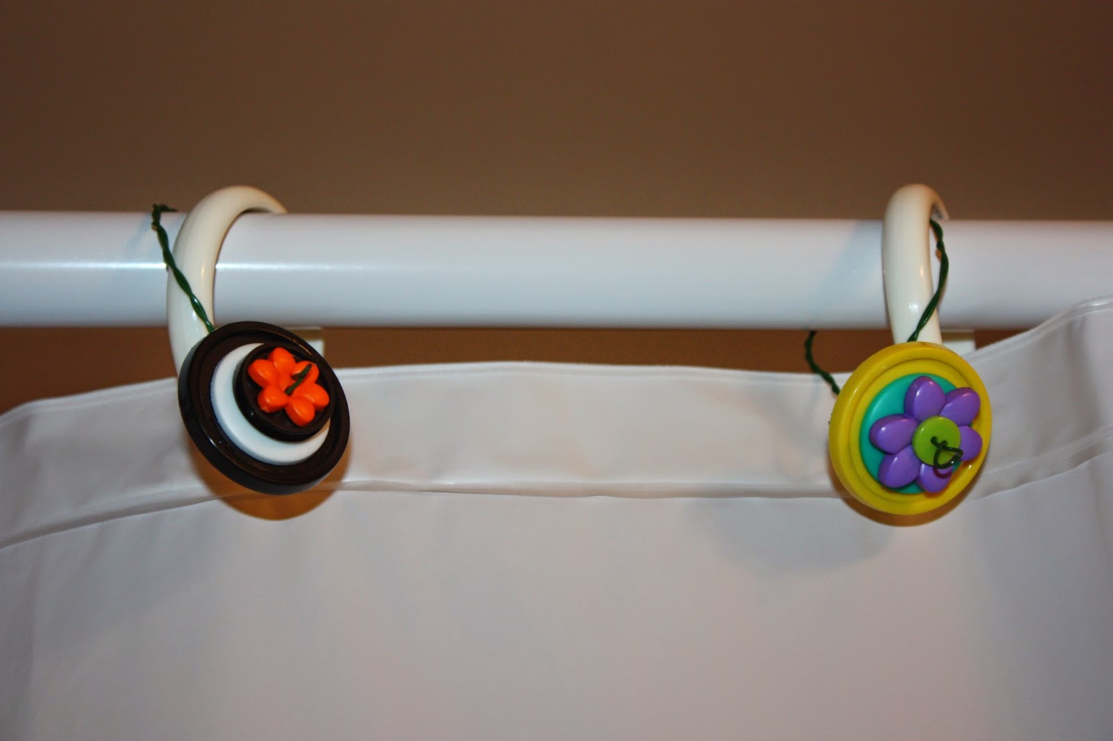 Well, I added them to the rings. Some of the rings are missing anyway, so instead of buying a new set for one or two, I just looped the button flowers to hang the shower curtain. It adds a little pop of color.